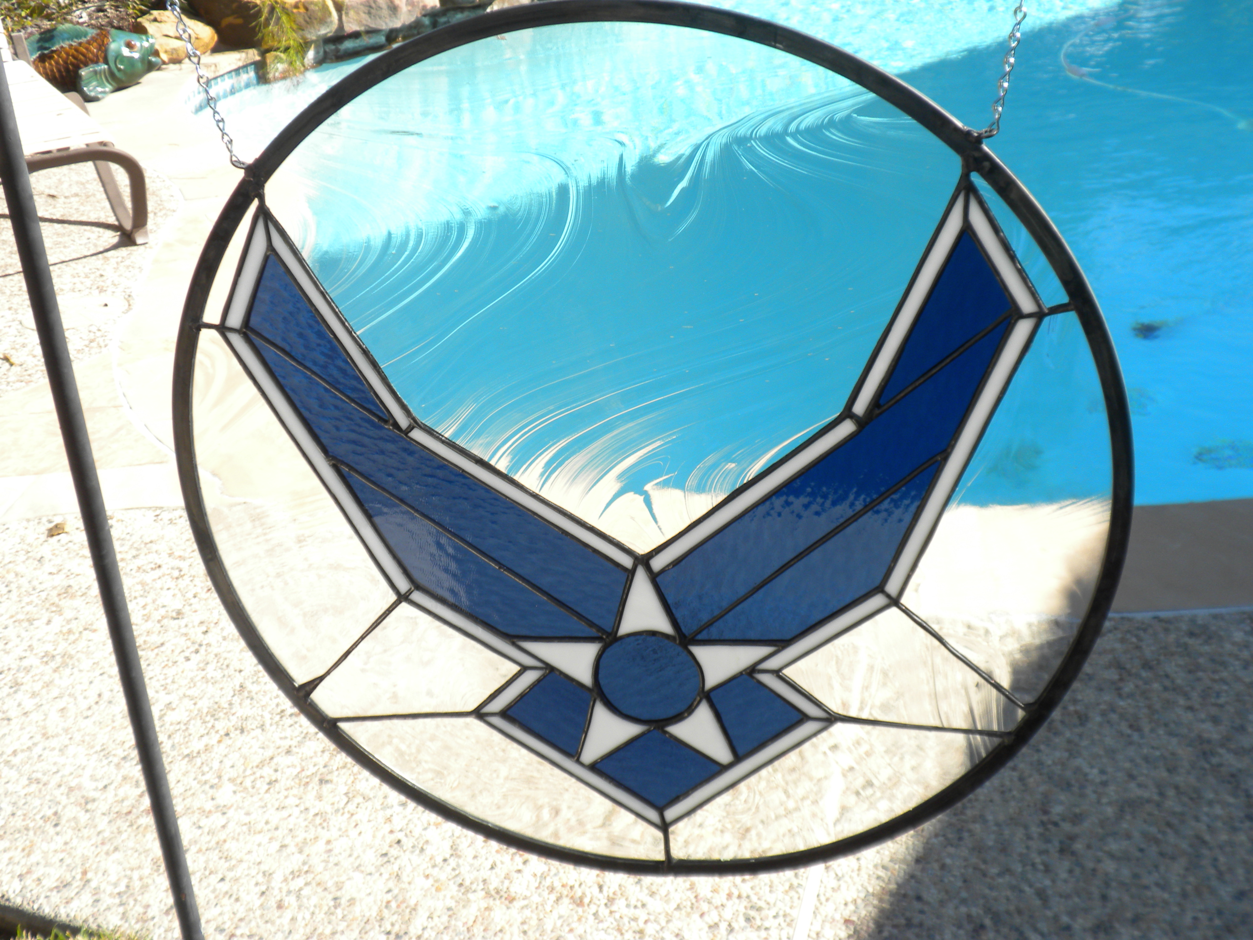 Beautiful Air Force Emblem made with clear and navy stained glass. It measures approximately 23” circle. Call (713) 899-0933 to order yours today or for more information!!