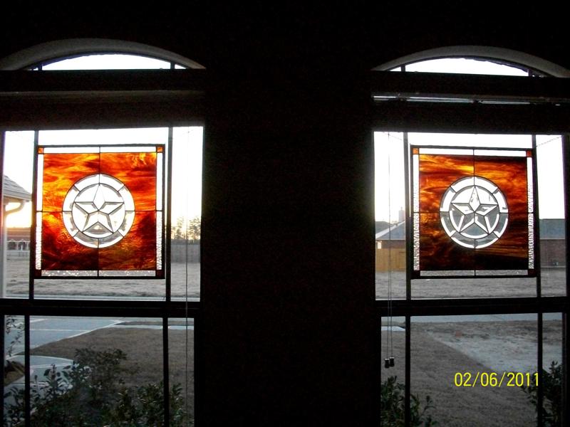 This Beautiful Texas Star is approximately 21-1/2″ x 21-1/2″.  It has a bevel cluster in the middle with the star.  Beautiful brown glass around the cluster.  It has twisted lead over the zinc border which gives it a wonderful look.  This was a custom piece where the owner had two windows in their study and hung one in each window.  Beautiful with the sun coming through and a great way to show off your home!  Call (713) 899-0933 for more information on this piece or to order  your own.