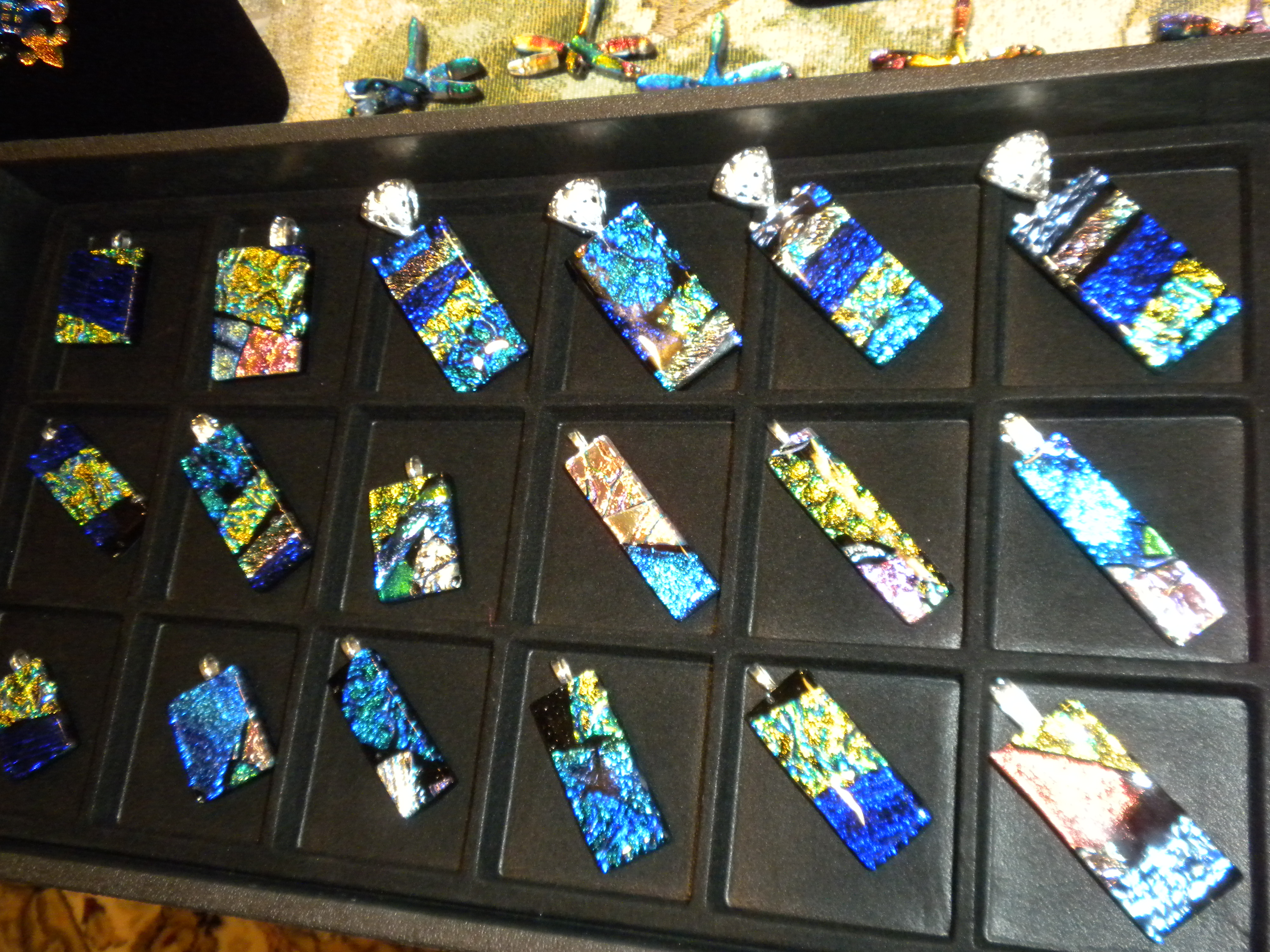 Beautiful Glass Pendants made from stained glass and dicroic fused together! Several different sizes and shapes and colors. Comes on a 20″ silver plated necklace. Have different beautiful colors. Pictures don’t do them justice. They are beautiful. If you would like to see them please let me know at (713) 899-0933!!