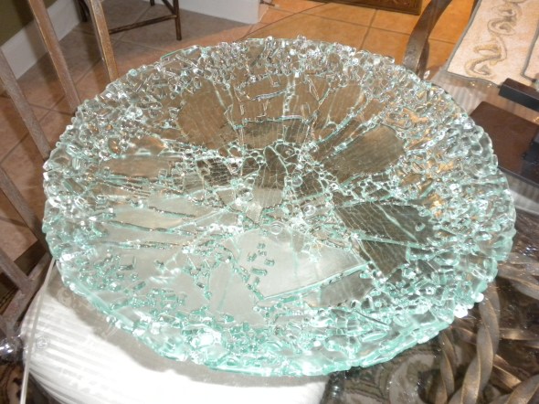 Beautiful Tempered Glass Bowl. Measures approximately a 17″ circle. Can be made any size. Made from Tempered Glass bits formed into a beautiful piece of art. Can be used as a bowl or a wall hanging. No two alike. For more information please call (713) 899-0933!