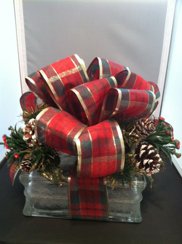 This beautiful block is approximately 8″x 8″ and has lights inside. It has a beautiful plaid bow with matching jeweled