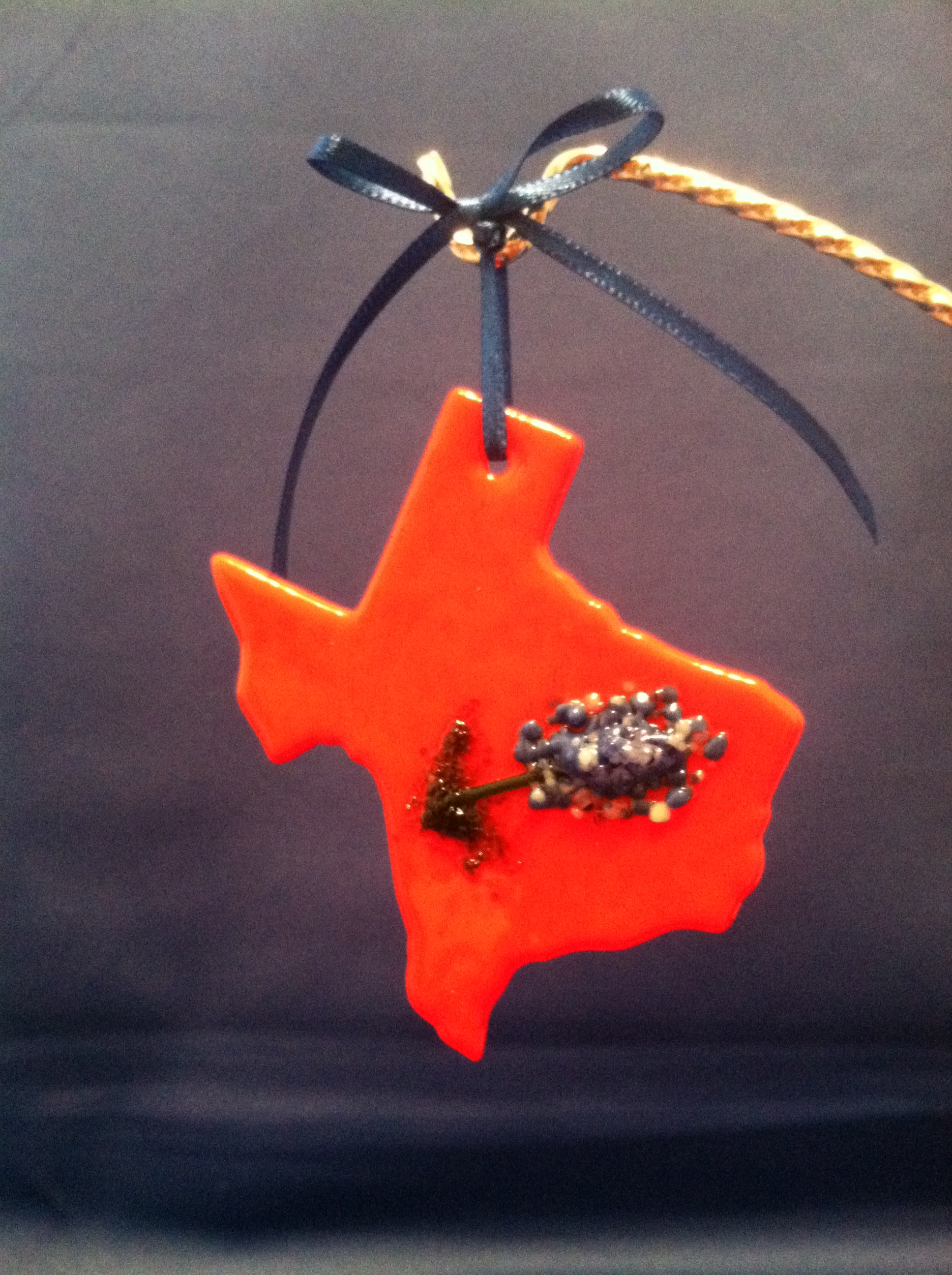 Red Texas Bluebonnet Stained Glass Ornament . The State of Texas and a Texas Bluebonnet overlayed. For more information call (713) 899-0933. Price for this piece is $14.95. There were only a select few made so order yours today so that you won’t miss out!!
