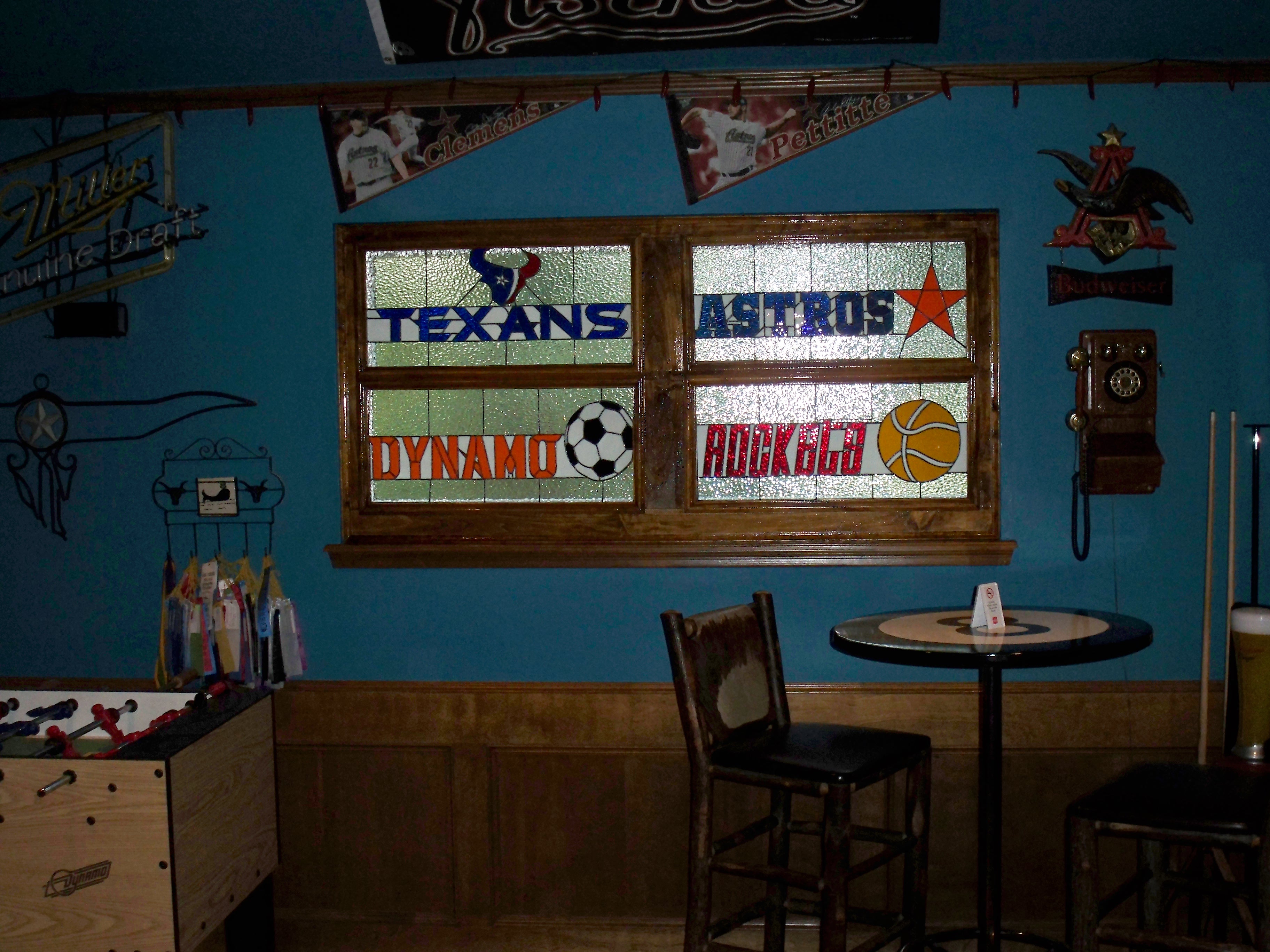 Four Sport Logo’s. Texsuns, Dynanmo’s, Astros and Rockets. Have been installed. Beautiful. No limit what you can do with stained glass windows!!
