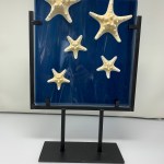Beautiful Starfish on blue and white glass sitting on a metal V base. Approximately 12″. For more information call (713) 899-0933!