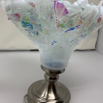 Beautiful Glass Lamp. Hot glass melted into this beautiful lamp made with white and clear swirl glass with Dichroic glass. It sits on a brushed nickel base and is approximately 11″ tall. Can be used as a lamp or a Pin Light. Beautiful with different colored bulbs.