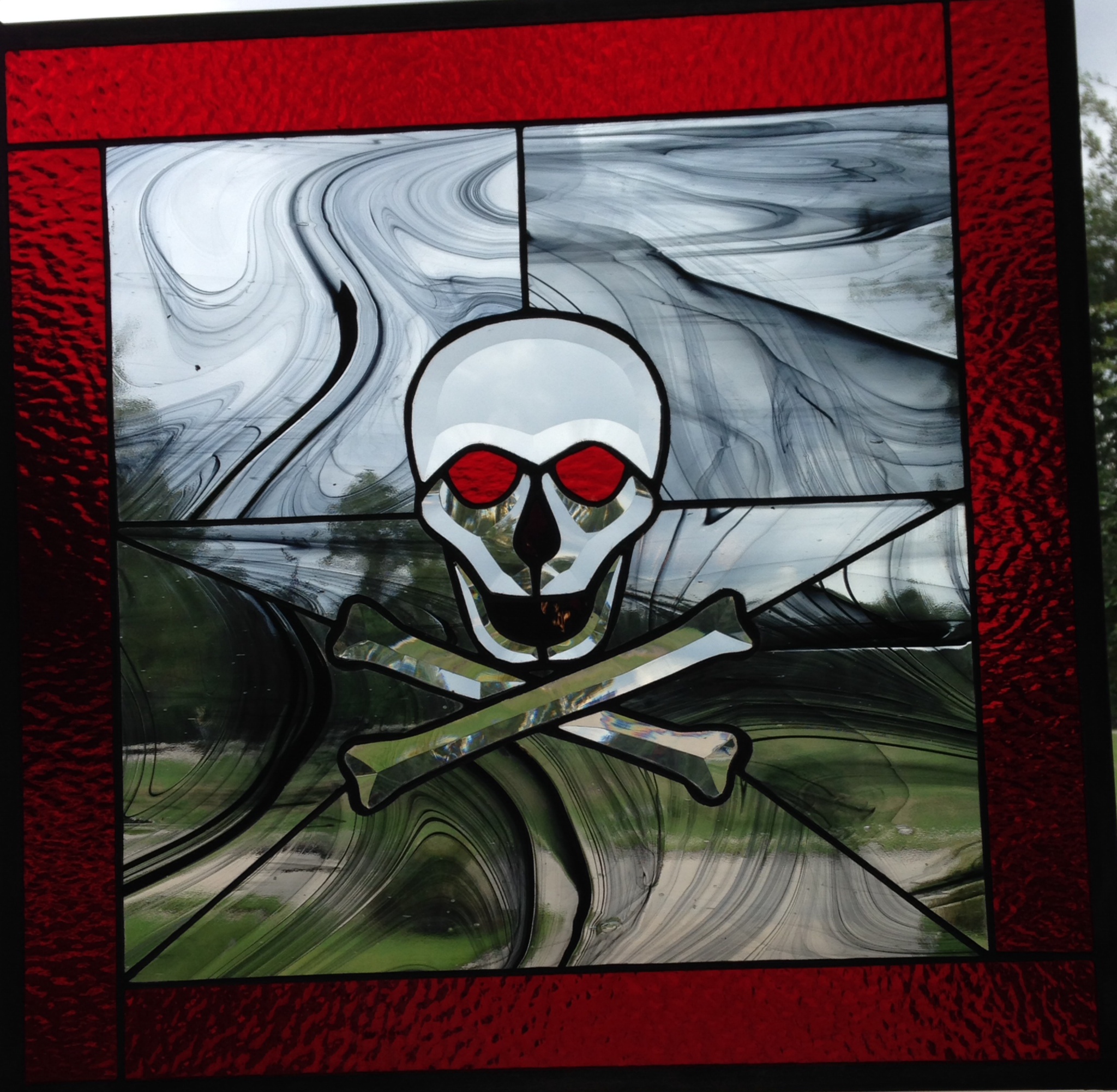 Beautiful Skull and Cross Bones Stained Glass. The skull and cross bones are beveled glass. Made with black and clear broque glass as the background with hammered red border. Measures approximately 20″ x 20″. Can be made with custom pieces or size. This one is available at this time. Call for more information (713) 899-0933.