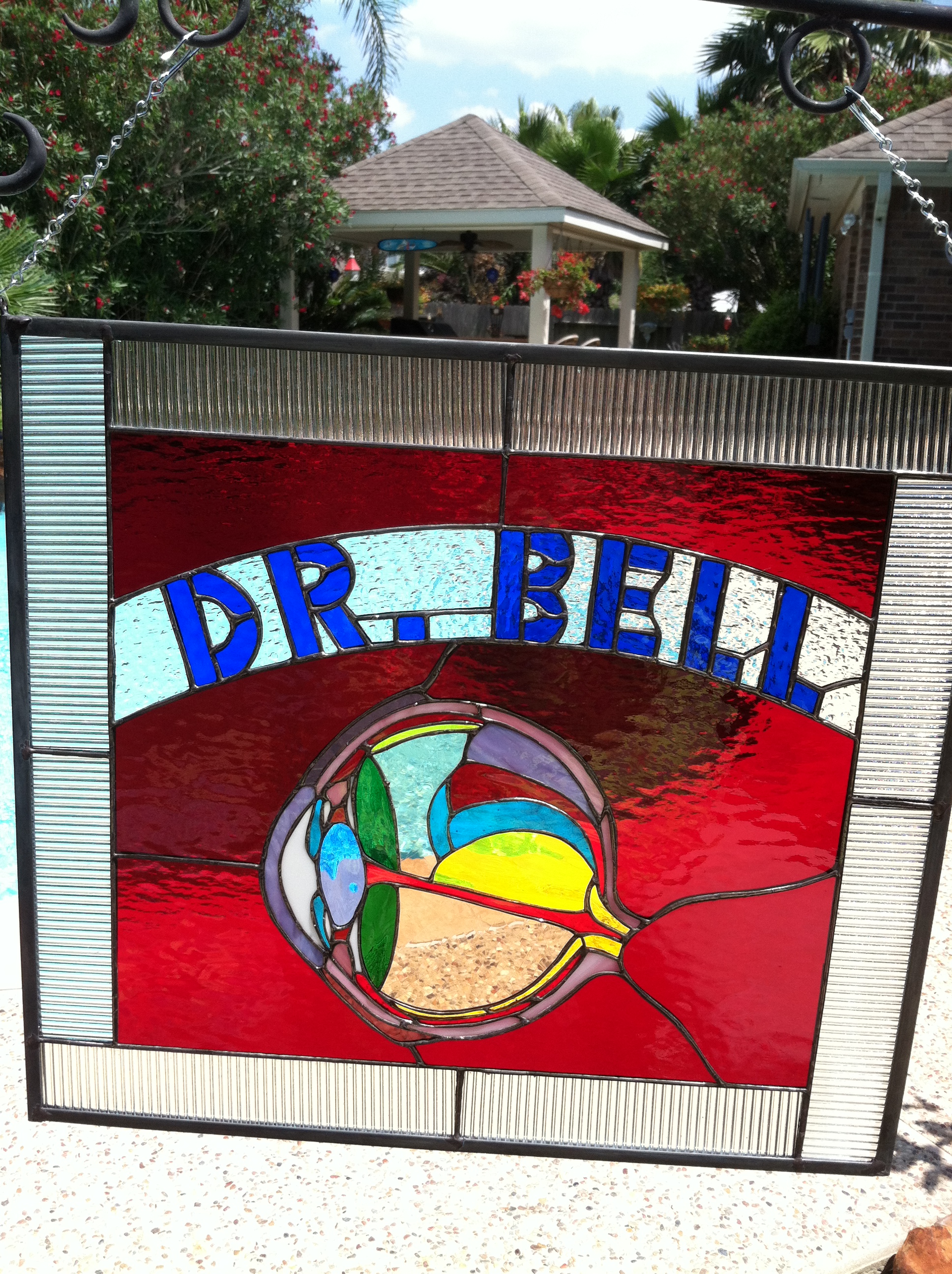 This piece was made for an Ocularist. It is an eye with his name as the eyelashes. It measures approximately 25″ x 18″. Made with beautiful Cobolt blue glass, clear broque and other beautiful colors. For more information please call (713) 899-0933.