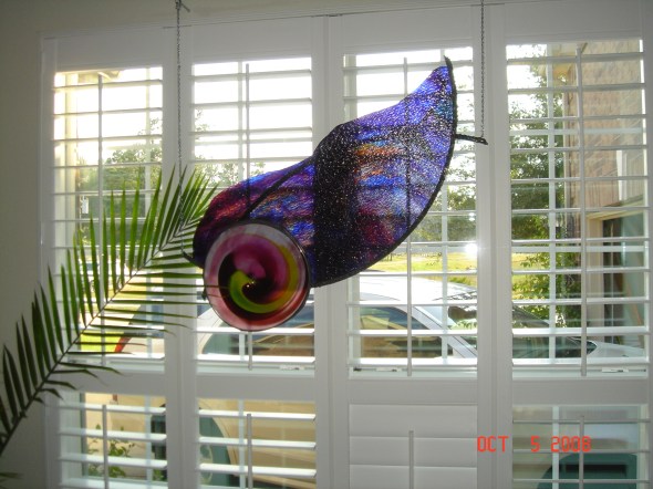 This piece reminded me of an Angel wing. It is made of beautiful blue, purple, gold glass with a beautiful large blown rondel. For more information call (713) 899-0933.
