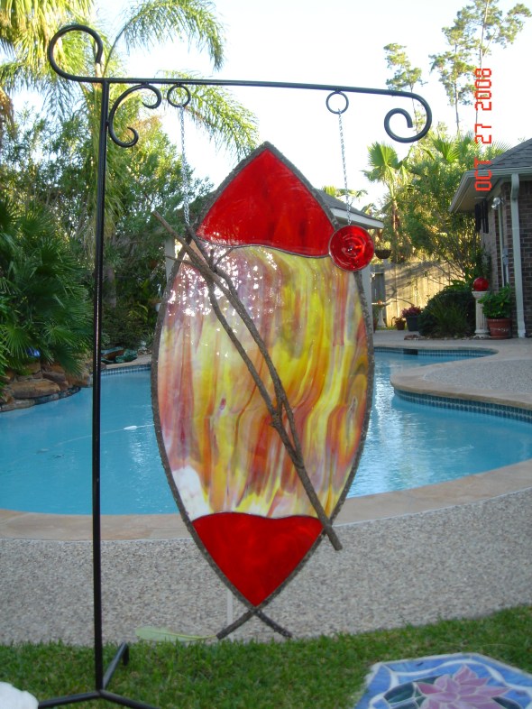 The Fish is made with beautiful colorful glass and with a red blown rondel. The branch across the front is a real branch that was wrapped in copper foil with decorative soldering on the foil. Beautiful!! For more information call (713) 899-0933.
