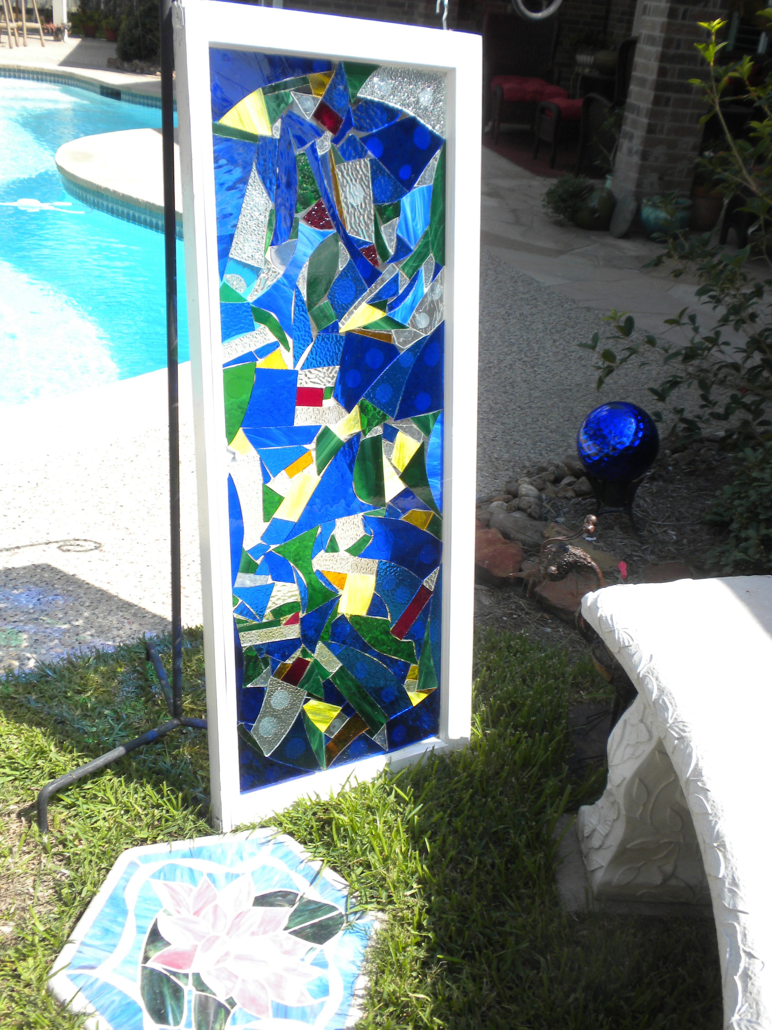 100 Year Old Window adorned with mirrow tiles, stained glass and colored glass pieces