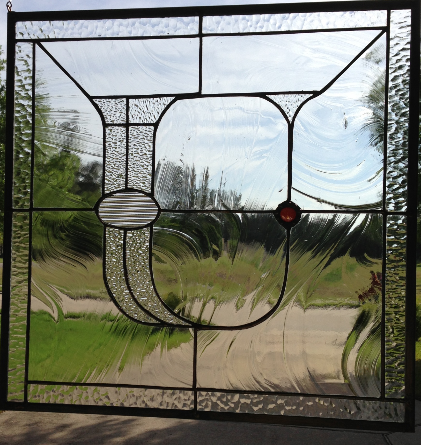 Beautiful stained glass initial “U”. Measures approximately 18 inches. Is made with all clear glass with different textures. Has a colored glass stone with decorative soldering around the stone. For more information please call (713) 899-0933.