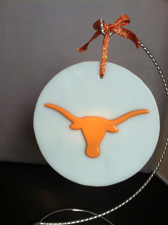 Texas Stained Glass Ornament is approximately a 5″ circle with the State of Texas and a Texas Star. It has a white background with the Texas Longhorn orange Texas with a white star. For more information call (713) 899-0933. Price for this piece is $18.95. There were only a select few made so order yours today so that you won’t miss out!!