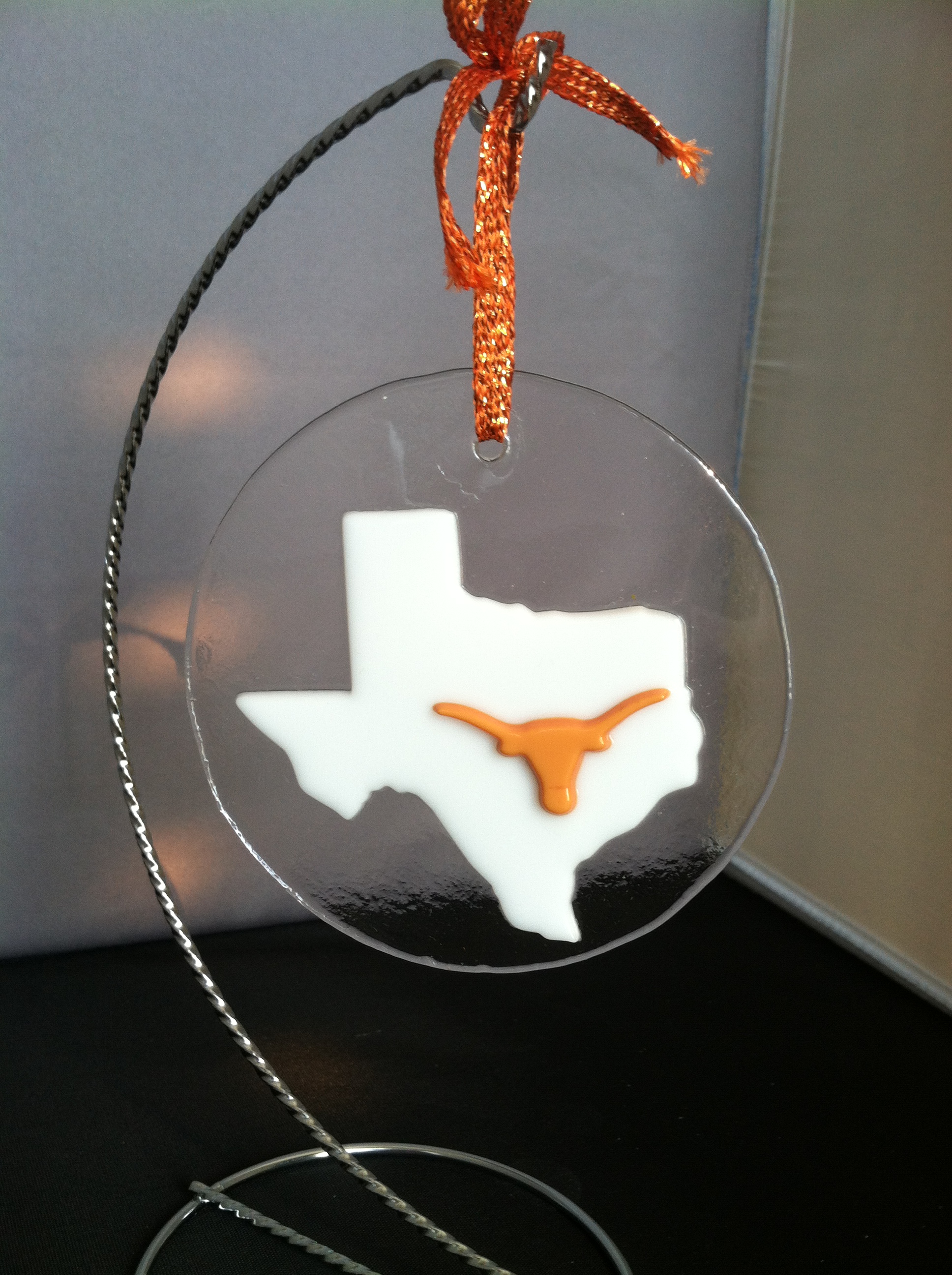 Texas Longhorn Stained Glass Ornament is approximately a 4″ circle with the white State of Texas and Longhorn. It has a Clear background with white Texas and orange Longhorn. For more information call (713) 899-0933. Price for this piece is $14