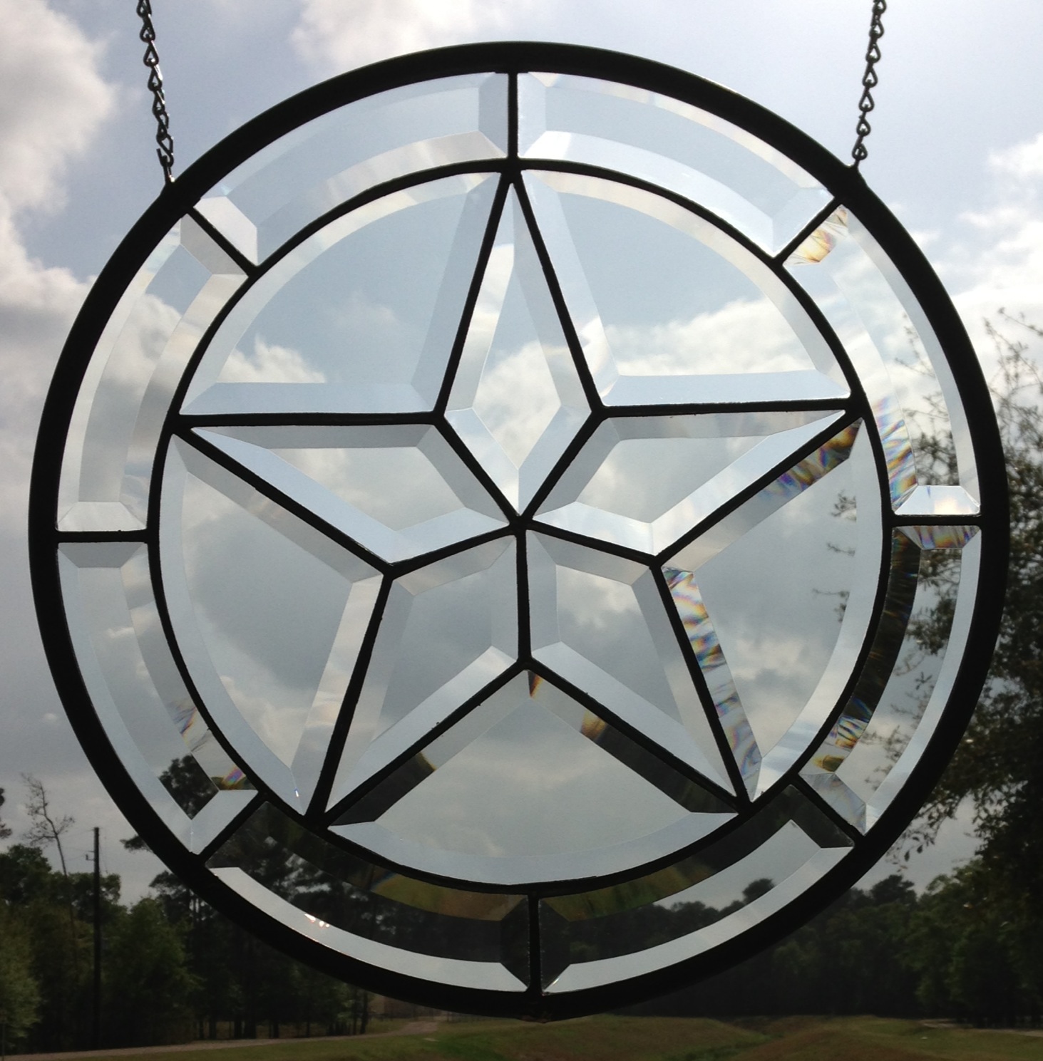 Beveled Texas Star with red, white and blue around it. Twisted lead around diameter. Approximately 19″ diameter. For more information call (713) 899-0933!!