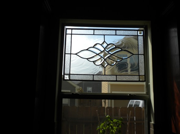 Bevel Cluster. This was a custom piece made for a kitchen window. Came out beautiful. Made with a bevel cluster and different textures of clear. Call (713) 899-0933 for more information and pricing.