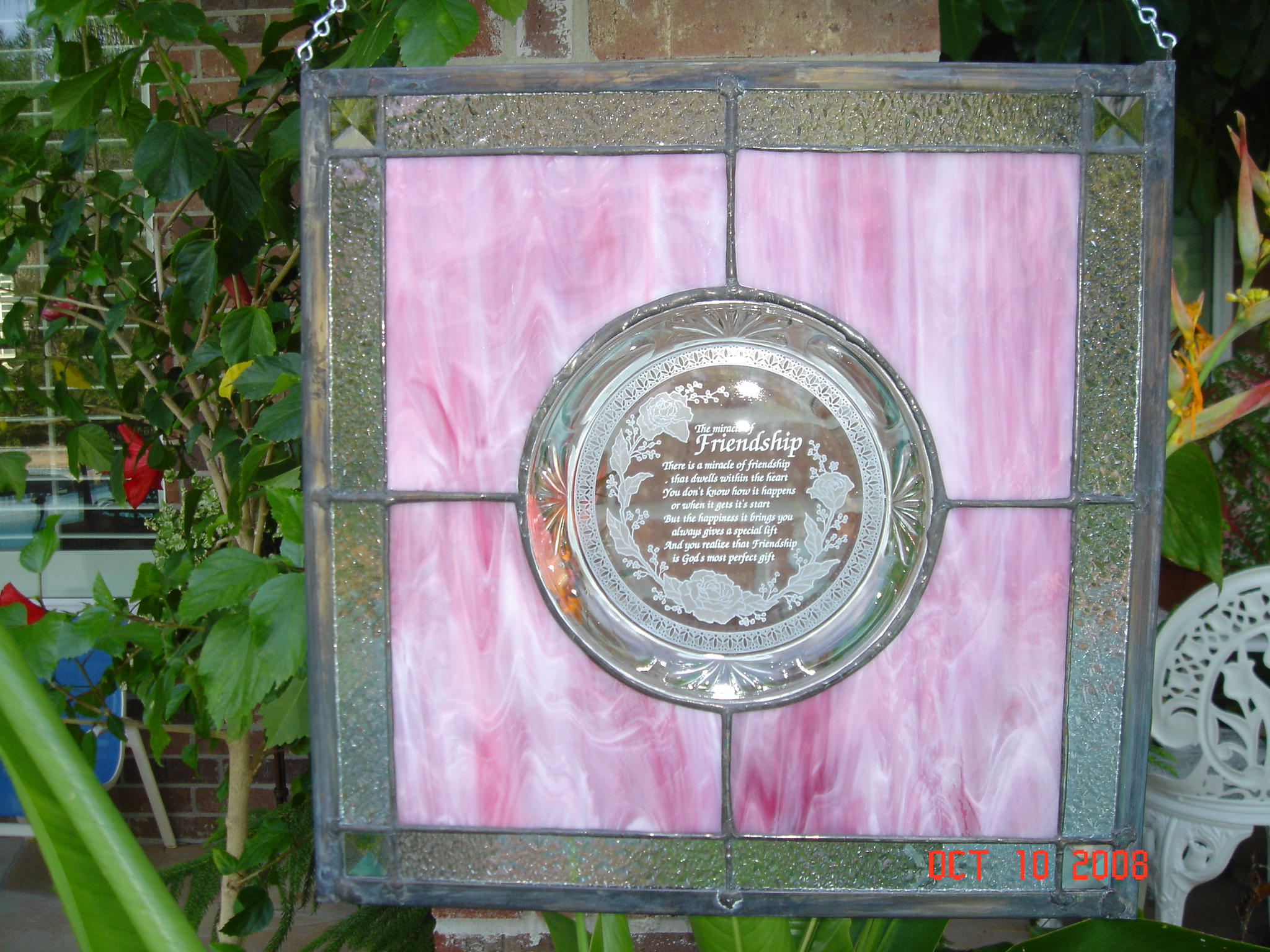 This piece is made with a Friendship Plate with a beautiful poem with whispy pink glass around the plate. One left, for more information call (713) 899 0933.