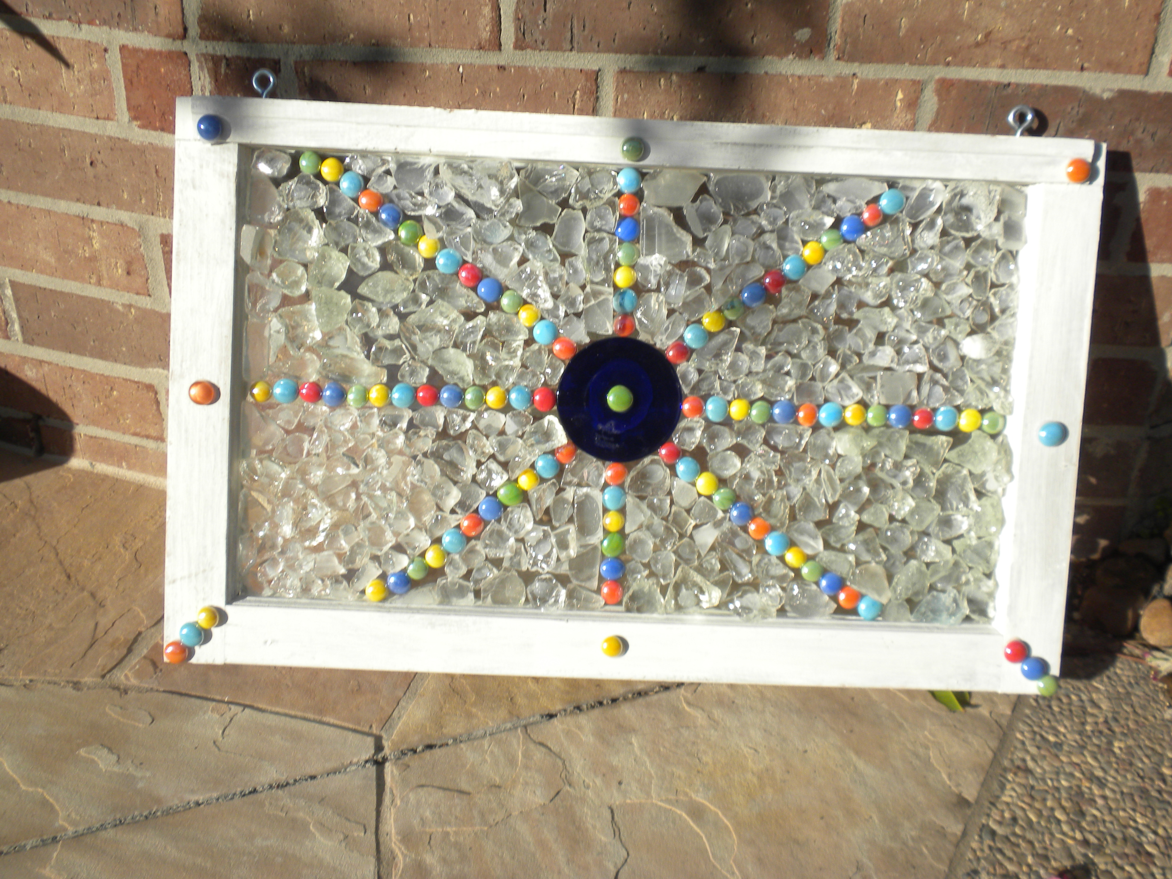 100 Year Old Window adorned with mirrow tiles, stained glass and colored glass pieces